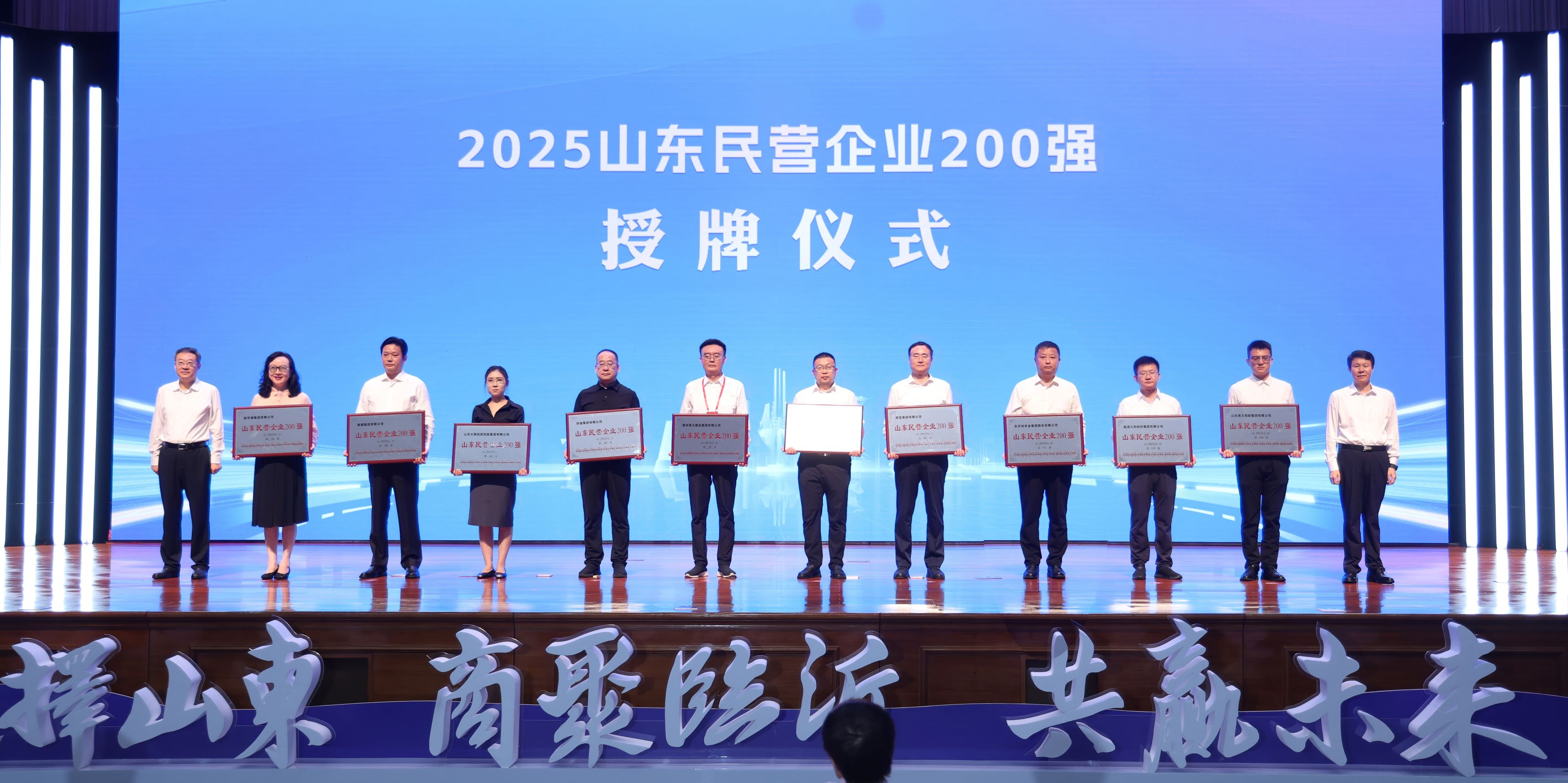 8月19日,由山東省工商聯(lián)、省發(fā)展改革委、省科技廳、省人力資源社會(huì )保障廳、省農業(yè)農村廳、省商務(wù)廳、省稅務(wù)局、省市場(chǎng)監管局、省總商會(huì )共同舉辦的2025山東民營(yíng)企業(yè)百強系列榜單發(fā)布會(huì )在臨沂舉行。我集團榮登2025山東民營(yíng)企業(yè)200強和吸納就業(yè)100強榜單,分別列第93位和第12位。楊為東董事長(cháng)代表企業(yè)上臺領(lǐng)獎。省人大常委會(huì )副主任、省工商聯(lián)主席、省總商會(huì )會(huì )長(cháng)王隨蓮,省委統戰部副部長(cháng)、省工商聯(lián)黨組書(shū)記、常務(wù)副主席張?chǎng)H等領(lǐng)導為獲獎企業(yè)頒獎。